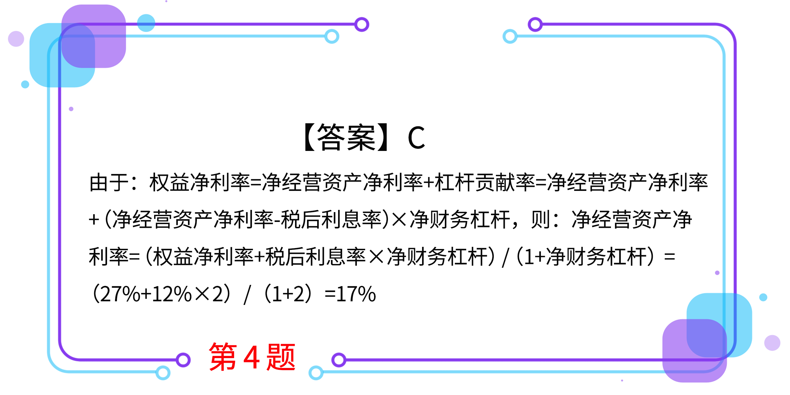 4.某公司2017年管理用財(cái)務(wù)分析體系中,權(quán)益凈利率為27%,稅后利息率為12%,凈財(cái)務(wù)杠桿為2,則凈經(jīng)營(yíng)資產(chǎn)凈利率為( )。