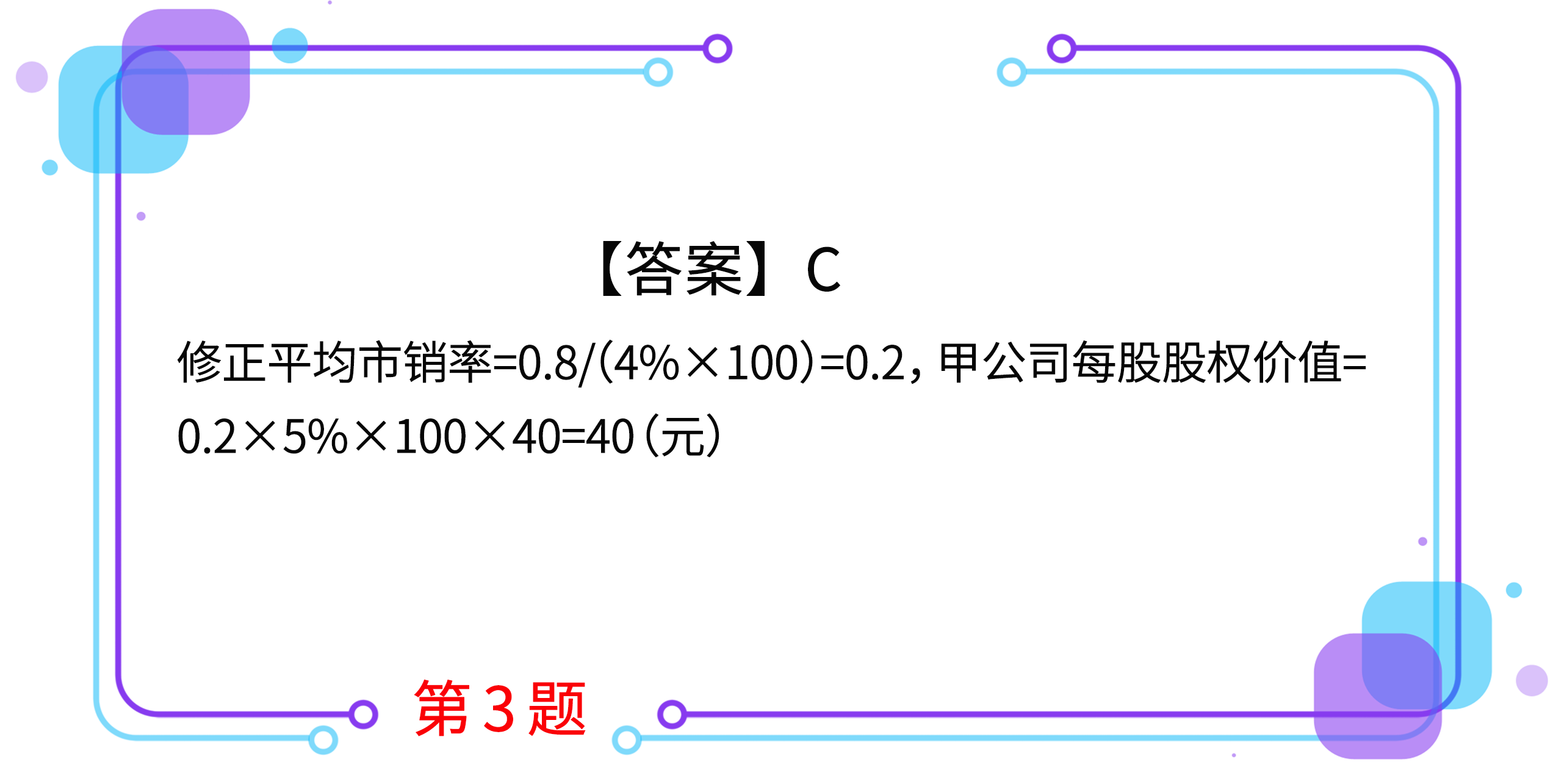 3.甲公司是一家制造業(yè)企業(yè),每股營業(yè)收入40元,營業(yè)凈利率5%,與甲公司可比的3家制造業(yè)企業(yè)的平均市銷率是0.8倍,平均營業(yè)凈利率4%。用修正平均市銷率法估計的甲公司每股股權(quán)價值是( )元。(2018年第Ⅰ套)