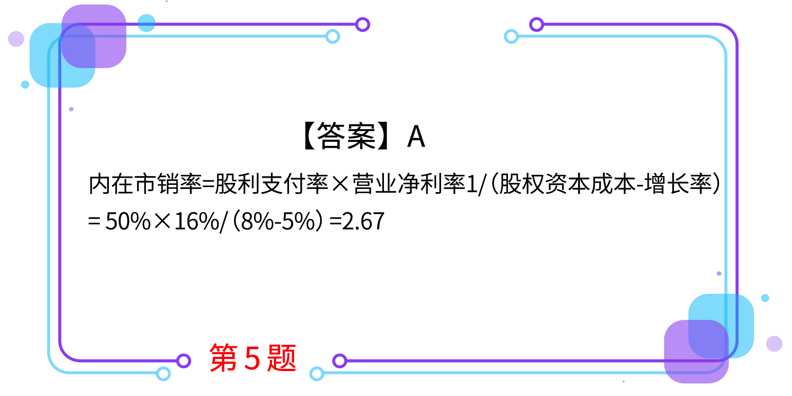 5.甲公司進入可持續(xù)增長狀態(tài),股利支付率50%,營業(yè)凈利率16%,股利增長率5%,股權(quán)資本成本8%。甲公司的內(nèi)在市銷率是( )。(2016年)