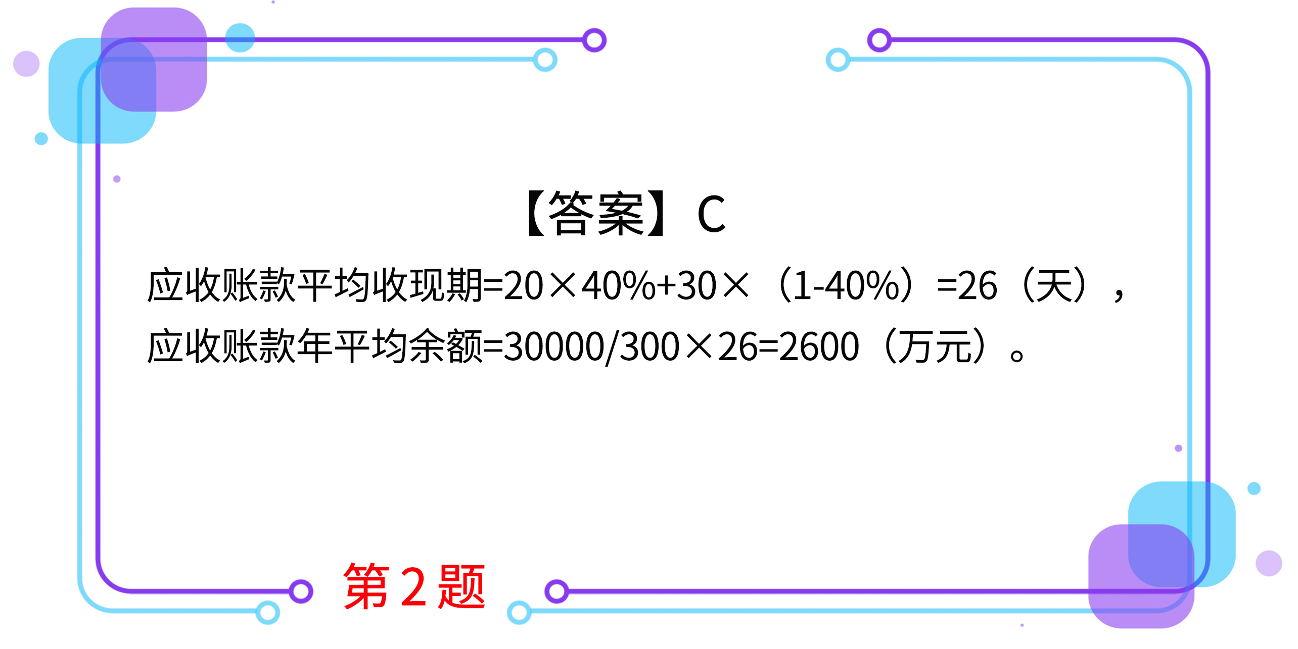 2.甲公司全年銷售額為30000萬元(一年按300天計(jì)算),信用政策是1/20、n/30,平均有40%的顧客(按銷售額計(jì)算)享受現(xiàn)金折扣優(yōu)惠,沒有顧客逾期付款。甲公司應(yīng)收賬款的年平均余額是( )萬元。