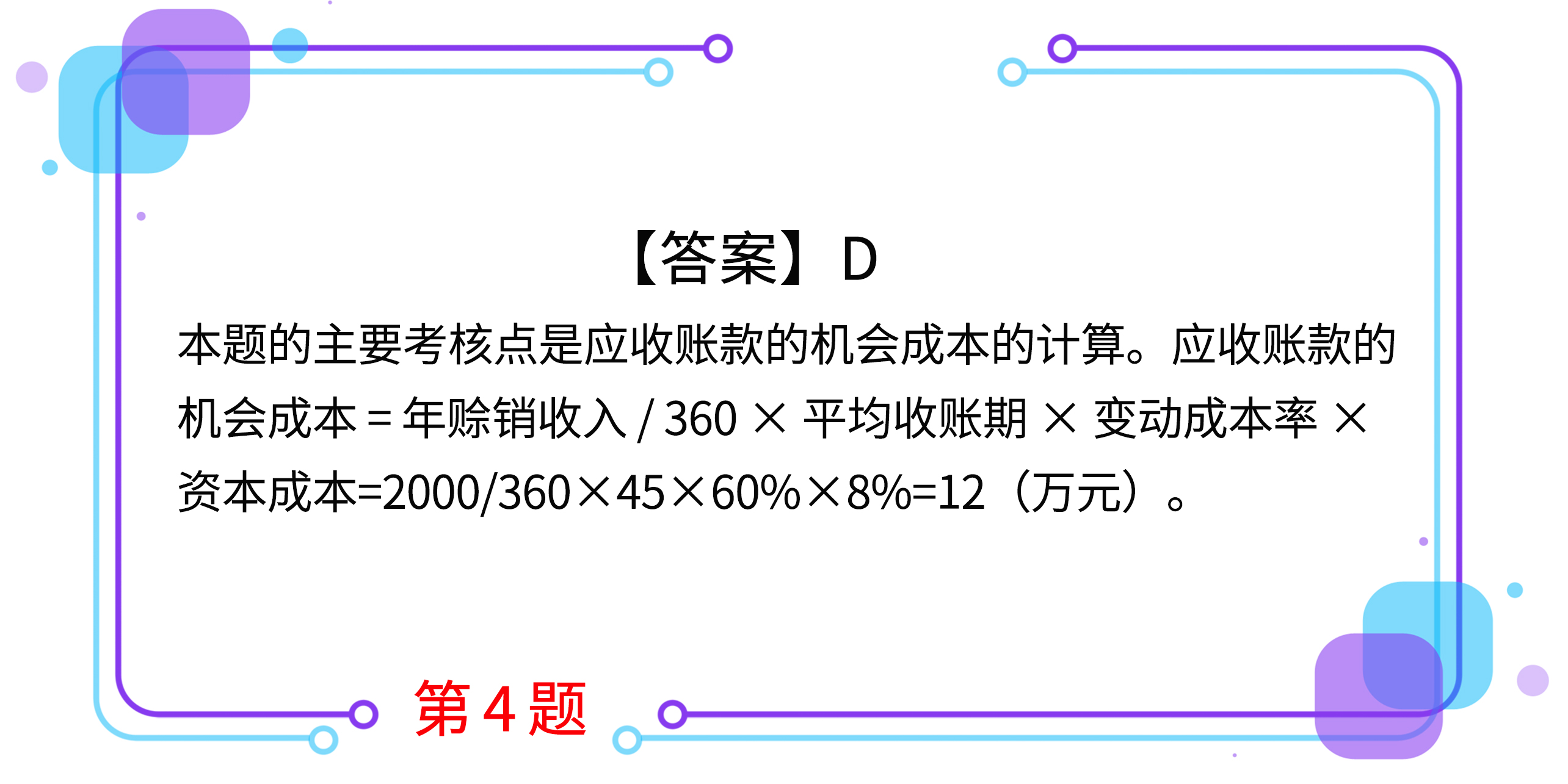 4.假設(shè)某企業(yè)預(yù)測(cè)的年賒銷額為2000萬元,應(yīng)收賬款平均收賬天數(shù)為45天,變動(dòng)成本率為60%,資本成本為8%,一年按360天計(jì)算,則應(yīng)收賬款的機(jī)會(huì)成本為( )萬元。