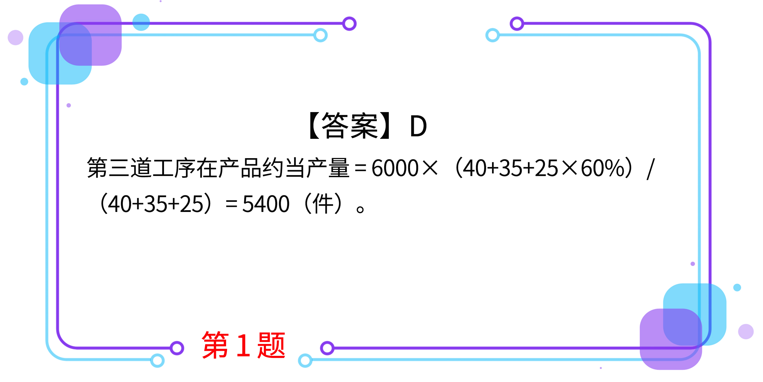 1.甲企業(yè)基本生產車間生產乙產品,依次經過三道工序,工時定額分別為40小時、35小時和25小時。月末完工產品和在產品成本采用約當產量法分配。假設制造費用隨加工進度在每道工序陸續(xù)均勻發(fā)生,各工序月末在產品平均完工程度60%,第三道工序月末在產品數(shù)量6000件。分配制造費用時,第三道工序在產品約當產量是(  )件。(2018年第Ⅰ套)