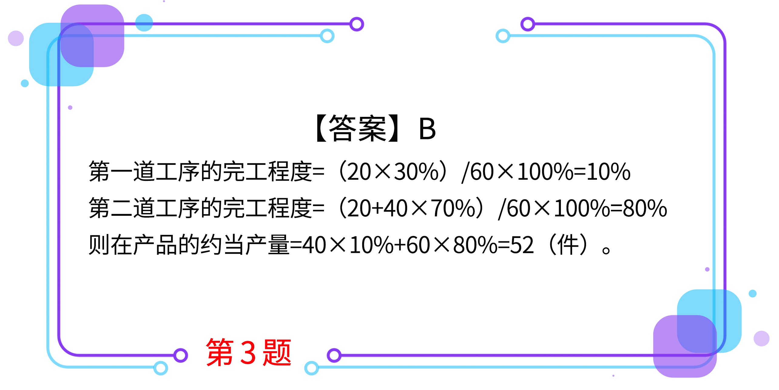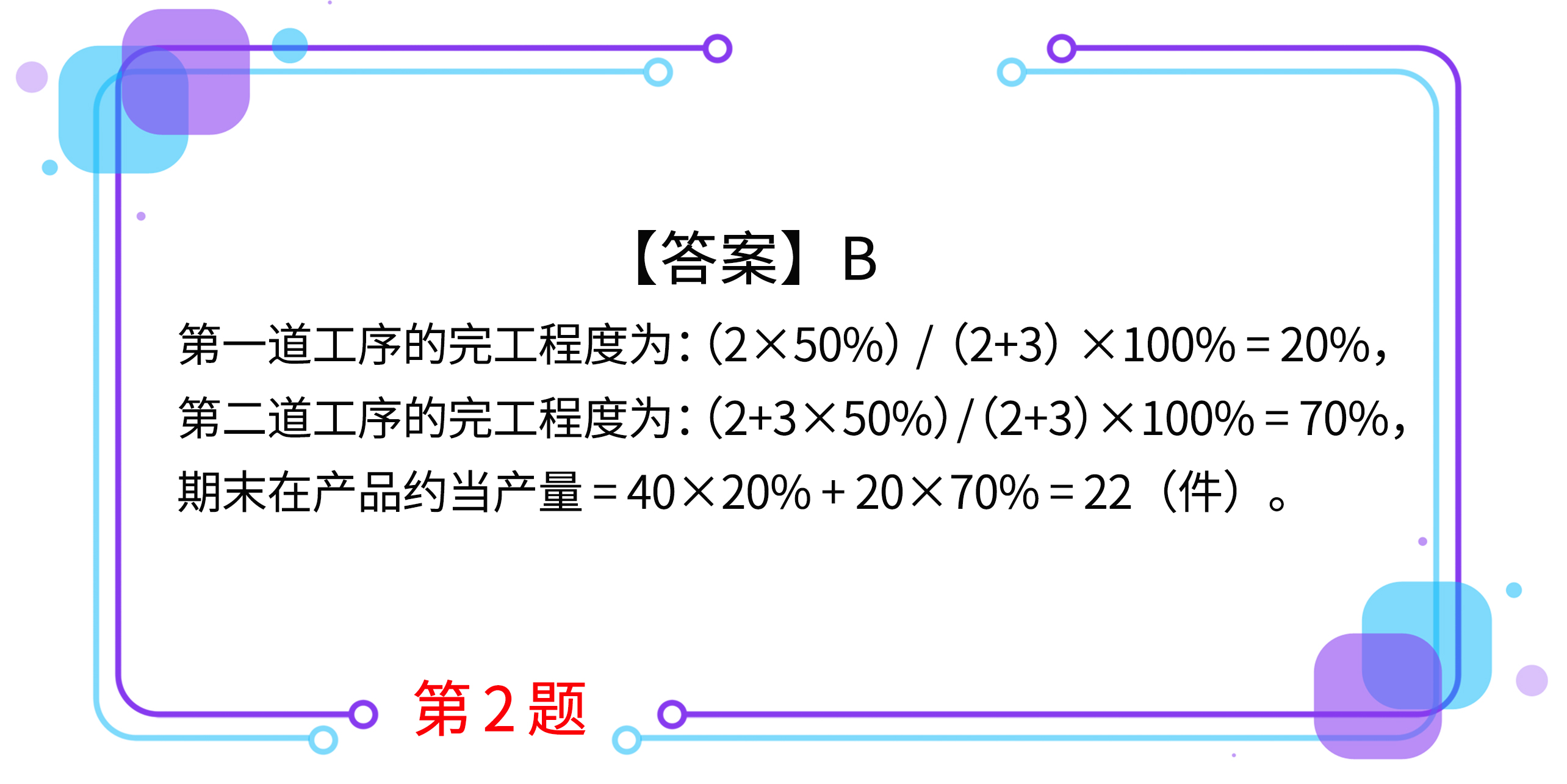 2.甲產品在生產過程中,需經過兩道工序,第一道工序定額工時2小時,第二道工序定額工時3小時。期末,甲產品在第一道工序的在產品40件,在第二道工序的在產品20件。以定額工時作為分配計算在產品加工成本(不含原材料成本)的依據(jù),其期末在產品約當產量為(  )件。