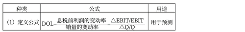 定義公式 | DFL=每股收益的變動(dòng)率/息稅前利潤(rùn)的變動(dòng)率=(△EPS/EPS)/(△EBIT/EBIT) | 用于預(yù)測(cè) |