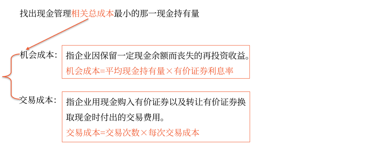 與現(xiàn)金持有量的關(guān)系 | 正比例變動(dòng) | 無(wú)明顯的比例關(guān)系(固定成本) | 反向變動(dòng) |