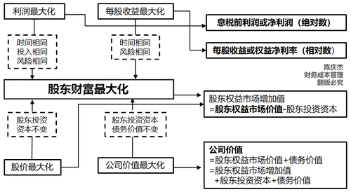 推導(dǎo) | 股東權(quán)益的市場價(jià)值 =股東投資資本(如果不變)+股東權(quán)益的市場增加值 股價(jià)最大化=股東權(quán)益的市場增加值最大化 股價(jià)最大化與增加股東財(cái)富有同等意義 | ||