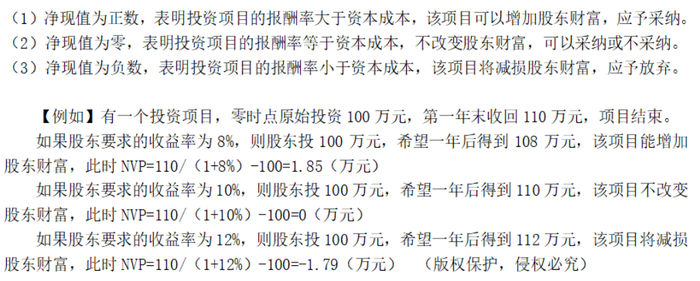 局限 | (1)它是絕對數(shù)指標(biāo),在比較投資額不同的項(xiàng)目時(shí)有一定的局限性(現(xiàn)值指數(shù)能克服這一缺點(diǎn)) 【問題】凈現(xiàn)值的單位是什么? 【備注】如果是獨(dú)立項(xiàng)目,原始投資額不同的項(xiàng)目需要按照投資效率排序。凈現(xiàn)值指標(biāo)不能完成任務(wù) (2)如果項(xiàng)目期限不同,不能直接根據(jù)凈現(xiàn)值判斷方案的優(yōu)劣(共同年限法、等額年金法能克服這一缺點(diǎn)) 【備注】如果是兩個(gè)互斥項(xiàng)目,甲的項(xiàng)目計(jì)算期是3年,NPV=100。乙的項(xiàng)目計(jì)算期是6年,NPV=150,則凈現(xiàn)值指標(biāo)不能完成任務(wù),需要改進(jìn) (3)凈現(xiàn)值無法看出項(xiàng)目真實(shí)的收益率水平(內(nèi)含報(bào)酬率能克服這一缺點(diǎn)) 【備注】凈現(xiàn)值是人為設(shè)定的必要報(bào)酬率計(jì)算算出的結(jié)果,如果問項(xiàng)目的真實(shí)收益率,凈現(xiàn)值指標(biāo)不能完成任務(wù) |