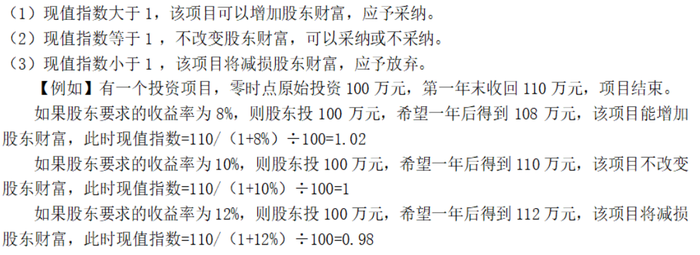 公式 | 【教材】現(xiàn)值指數(shù)=未來現(xiàn)金流量現(xiàn)值÷原始投資額現(xiàn)值 |
