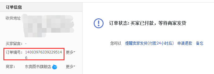 ①在天貓”東奧圖書(shū)旗艦店“下單成功后,保留”訂單編號(hào)“界面。
