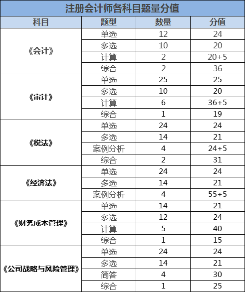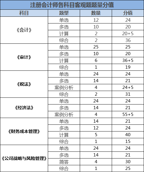 注冊(cè)會(huì)計(jì)師各科目題量分值