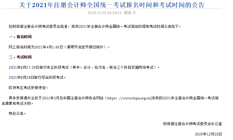 中國注冊會計師協(xié)會官方網(wǎng)站已經(jīng)發(fā)布2021年注會考試時間為8月27-29日