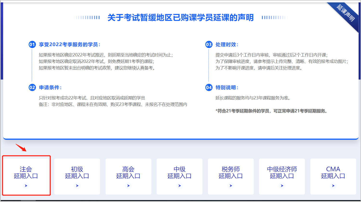 延期條件:針對含22考季服務(wù)學(xué)員,如果報(bào)考成功地區(qū)確定取消2022年考試,則免費(fèi)延期1考季的課程