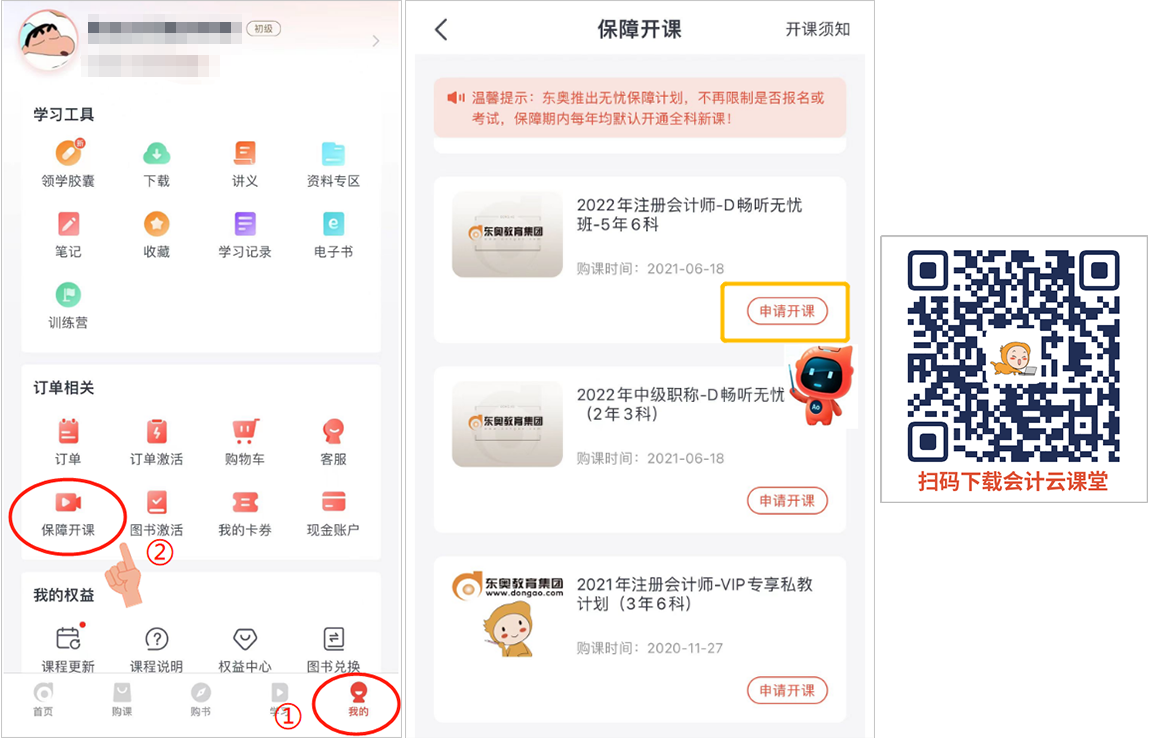 申請(qǐng)流程:打開(kāi)會(huì)計(jì)云課堂→我的→保障開(kāi)課→申請(qǐng)開(kāi)課→人臉識(shí)別驗(yàn)證后→開(kāi)課成功