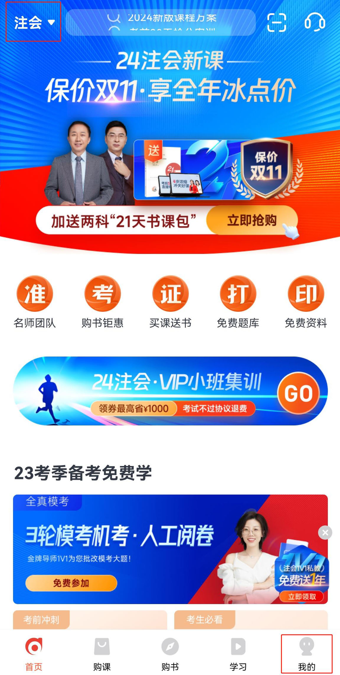 步驟一:登錄“會(huì)計(jì)云課堂”app,左上角選擇注會(huì)頻道,下方切換至“我的”頁面