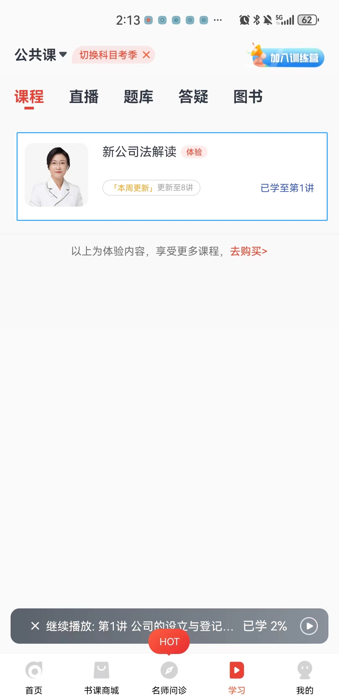 進(jìn)入“注冊會計師-公共課”頁面,可以直接看到黃潔洵老師主講的“新公司法解讀”課程,點(diǎn)擊“去聽課”可開始該課程的學(xué)習(xí)。