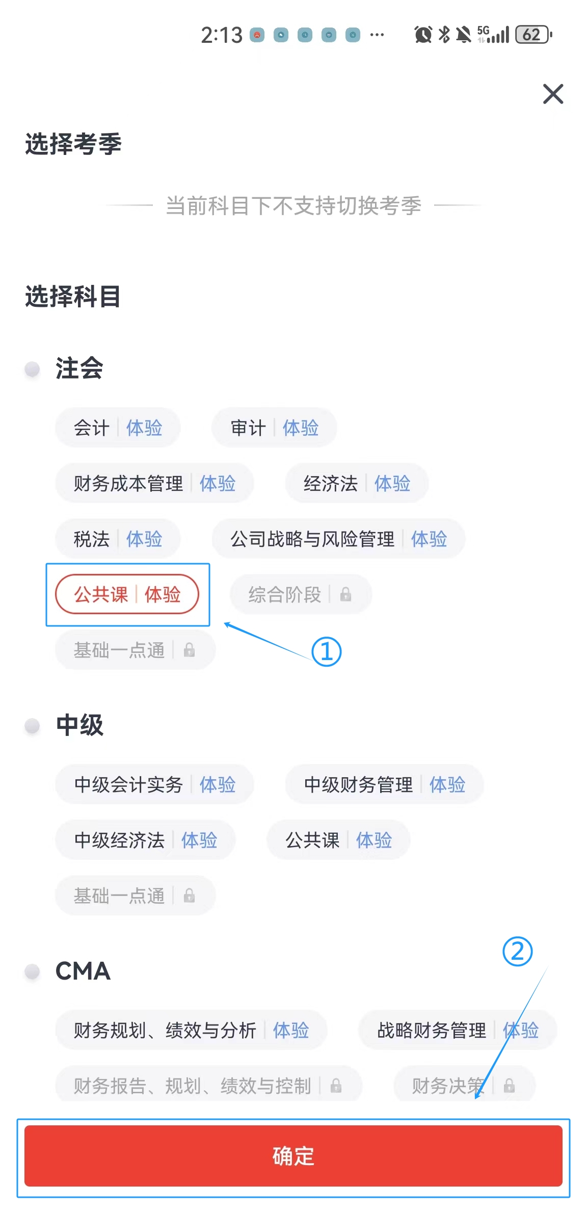 ▎步驟二:進(jìn)入切換界面,選擇“注會-公共課”,點(diǎn)擊頁面下方的“確定”按鈕。