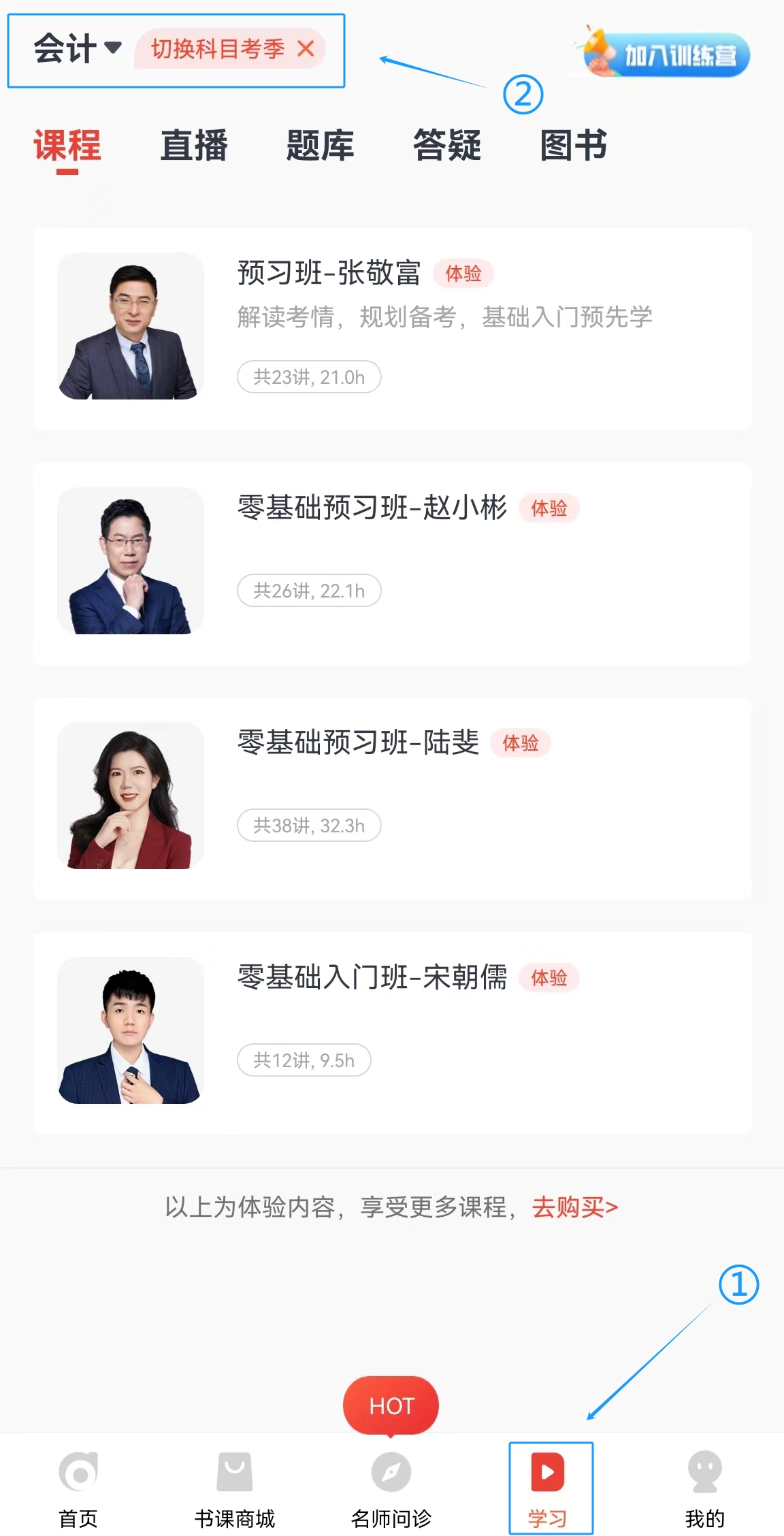 ▎步驟一:登錄/注冊個人賬號,點(diǎn)擊下方菜單中的“學(xué)習(xí)”按鈕,并在“學(xué)習(xí)”頁面上方切換科目考季。