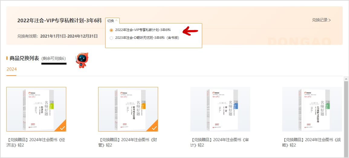 如有多個(gè)含書商品,可以點(diǎn)擊切換選擇,同時(shí)請(qǐng)您注意各商品的兌換次數(shù),直接點(diǎn)擊您需要兌換的圖書,頁(yè)面最低端,點(diǎn)擊“兌換”按鈕即可(點(diǎn)擊圖片查看大圖)
