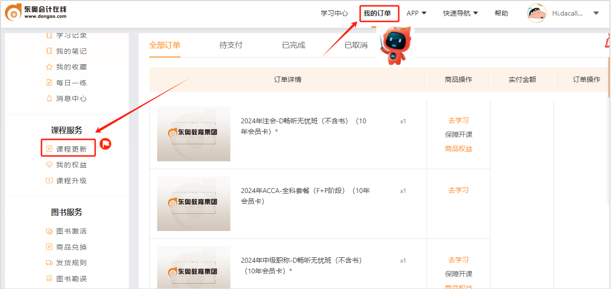 登錄ww.dongao.com→我的訂單→左側(cè)導(dǎo)航欄【課程服務(wù)】中“課程更新”→選擇科目→全部課程/我聽過(guò)的課程,即可查看課程上傳進(jìn)度(點(diǎn)擊圖片查看大圖)