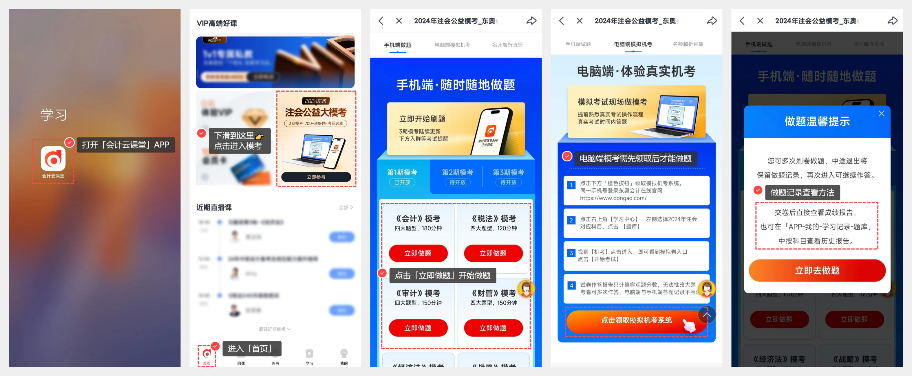 下載【會(huì)計(jì)云課堂】APP,進(jìn)入【首頁(yè)】下滑屏幕找到【注會(huì)公益大??肌?,點(diǎn)擊【點(diǎn)擊領(lǐng)取模擬機(jī)考系統(tǒng)】按鈕,即可做題??忌啥啻嗡⒕碜鲱},中途退出后將保留做題記錄,再次進(jìn)入繼續(xù)作答。點(diǎn)擊下圖查看步驟圖解!