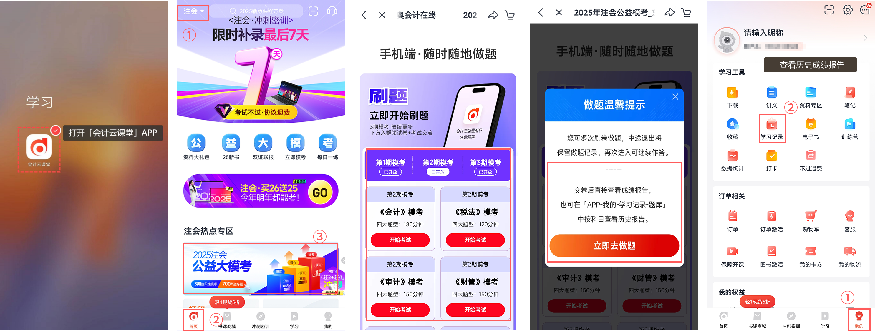 下載【會計云課堂】APP,選擇注會考種,進入【首頁】下滑屏幕找到【注會公益大模考】,點擊【點擊領(lǐng)取模擬機考系統(tǒng)】按鈕,即可做題??忌啥啻嗡⒕碜鲱},中途退出后將保留做題記錄,再次進入繼續(xù)作答。點擊下圖查看步驟圖解!