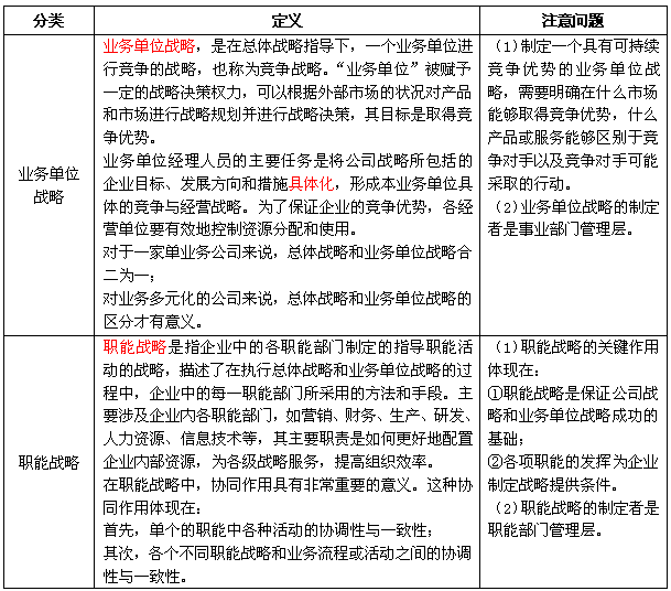 公司戰(zhàn)略分為三個層次:總體戰(zhàn)略、業(yè)務(wù)單位戰(zhàn)略(或競爭戰(zhàn)略)、職能戰(zhàn)略。