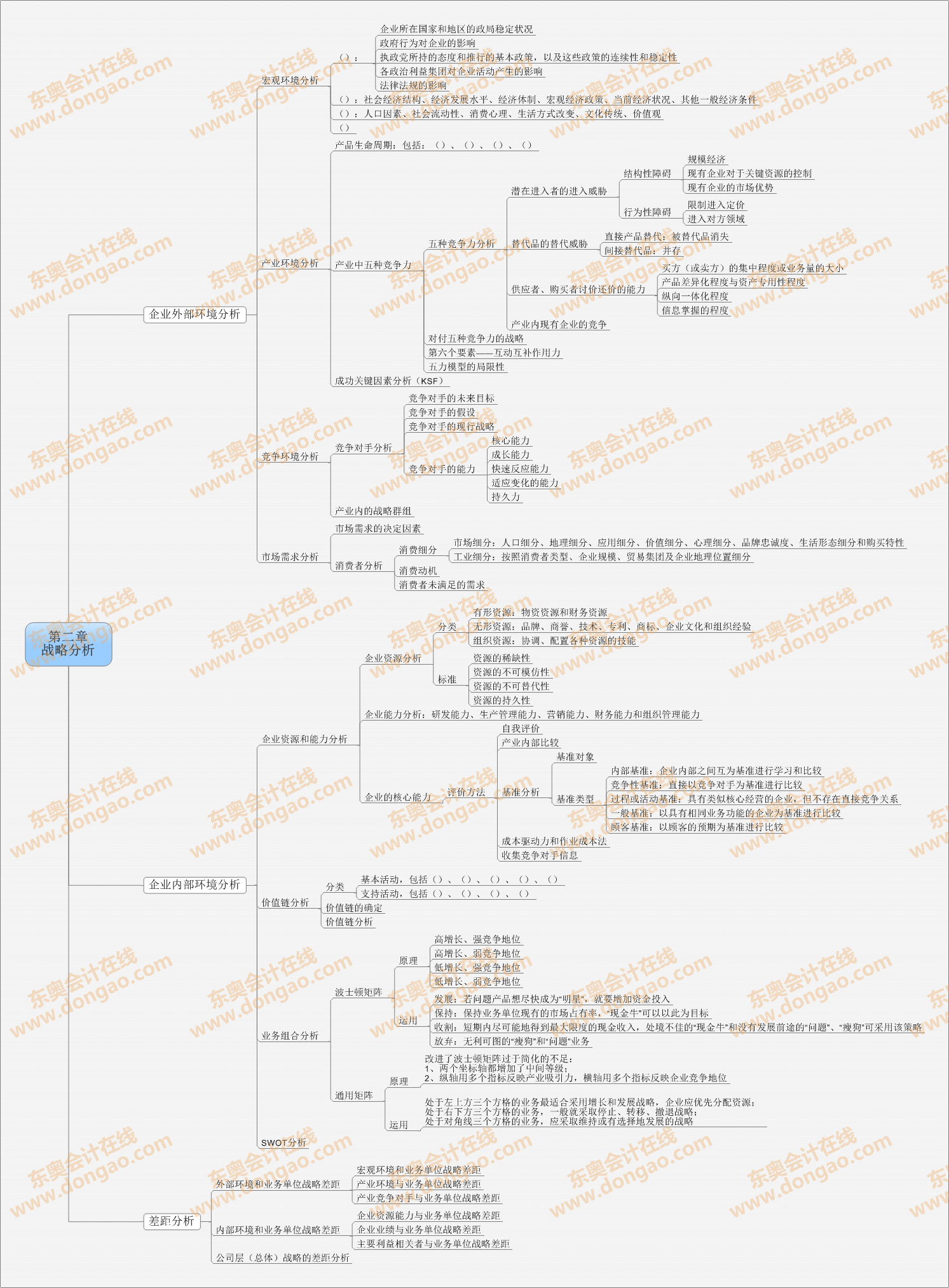 【東奧小編】2014年注冊會計師考試目前處于基礎備考階段,注會知識點繁雜細碎,想要全面掌握注會各科目的知識,需要科學高效的學習方法,思維導圖正是一種非常適合注會復習的學習方法,正確利用思維導圖,不僅能使自己積極進行知識點總結,形成清晰的思路,還能對知識點進行快速查漏補缺。以下是2014注會《公司戰(zhàn)略與風險管理》第二章戰(zhàn)略分析思維導圖: