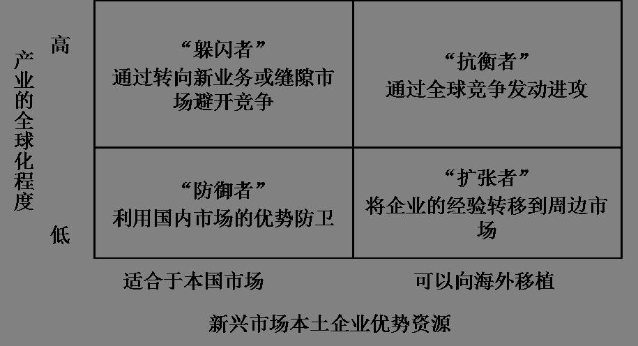 將產(chǎn)業(yè)所面臨的全球化壓力和新興市場(chǎng)本土企業(yè)可以轉(zhuǎn)移的資源作為兩個(gè)變量,作出下圖,可以用來(lái)指導(dǎo)公司戰(zhàn)略性的思考。