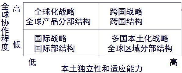 “國際戰(zhàn)略”是企業(yè)國際化經(jīng)營早期的戰(zhàn)略類型。此時,企業(yè)的全球化協(xié)作程度低,產(chǎn)品對東道國市場需求的適應能力也比較弱,在這種情況下,企業(yè)多把產(chǎn)品開發(fā)的職能留在母國,而在東道國建立制造和營銷職能。其組織結構往往采用國際部制。
