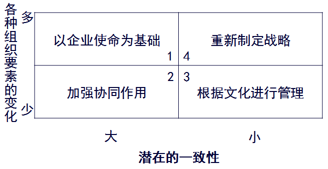 在第四象限,企業(yè)在處理戰(zhàn)略與文化的關(guān)系時,遇到了極大的挑戰(zhàn)。企業(yè)在實施一個新戰(zhàn)略時,組織的要素會發(fā)生重大的變化,又多與企業(yè)現(xiàn)有的文化很不一致,或受到現(xiàn)有文化的抵制。對于企業(yè)來講,這是個兩難問題。