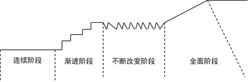 漸進(jìn)性變革過(guò)程可以分為連續(xù)階段(修正)、漸進(jìn)階段(充實(shí))、不斷改變階段(完善)和全面階段(提高)四個(gè)階段。(見(jiàn)下圖)