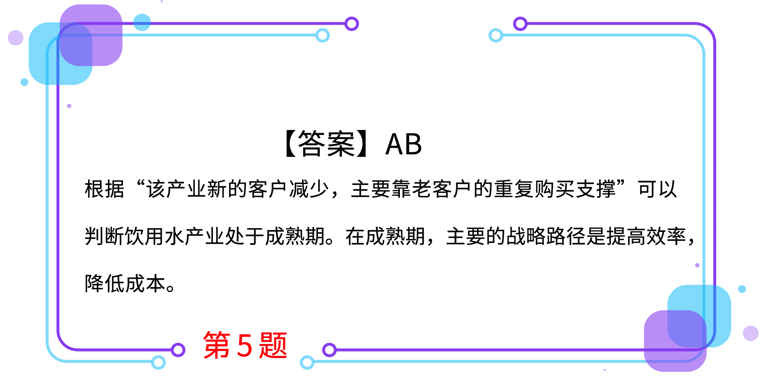 5.乙公司是一家集團企業(yè),業(yè)務(wù)涉及金融、出版、飲用水、水泥生產(chǎn)等。公司管理層針對飲用水業(yè)務(wù)進行分析時,發(fā)現(xiàn)該產(chǎn)業(yè)新的客戶減少,主要靠老客戶的重復(fù)購買支撐。對此,乙公司應(yīng)重點關(guān)注的有( )。