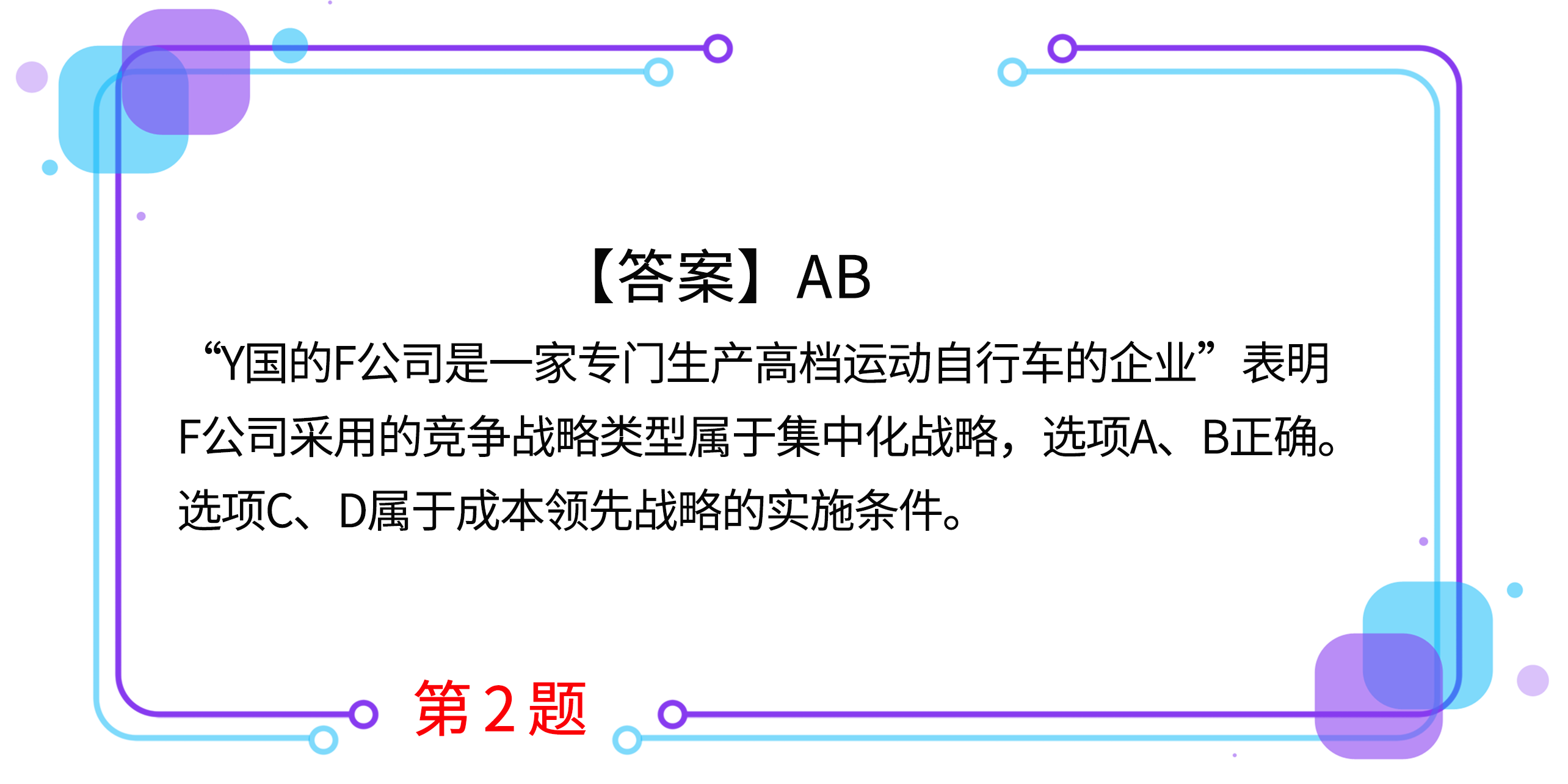2.Y國的F公司是一家專門生產(chǎn)高檔運(yùn)動自行車的企業(yè),其產(chǎn)品在Y國高檔運(yùn)動自行車細(xì)分市場上的占有率高達(dá)80%以上。下列各項中,屬于F公司競爭戰(zhàn)略實(shí)施條件的有( )。(2017年)