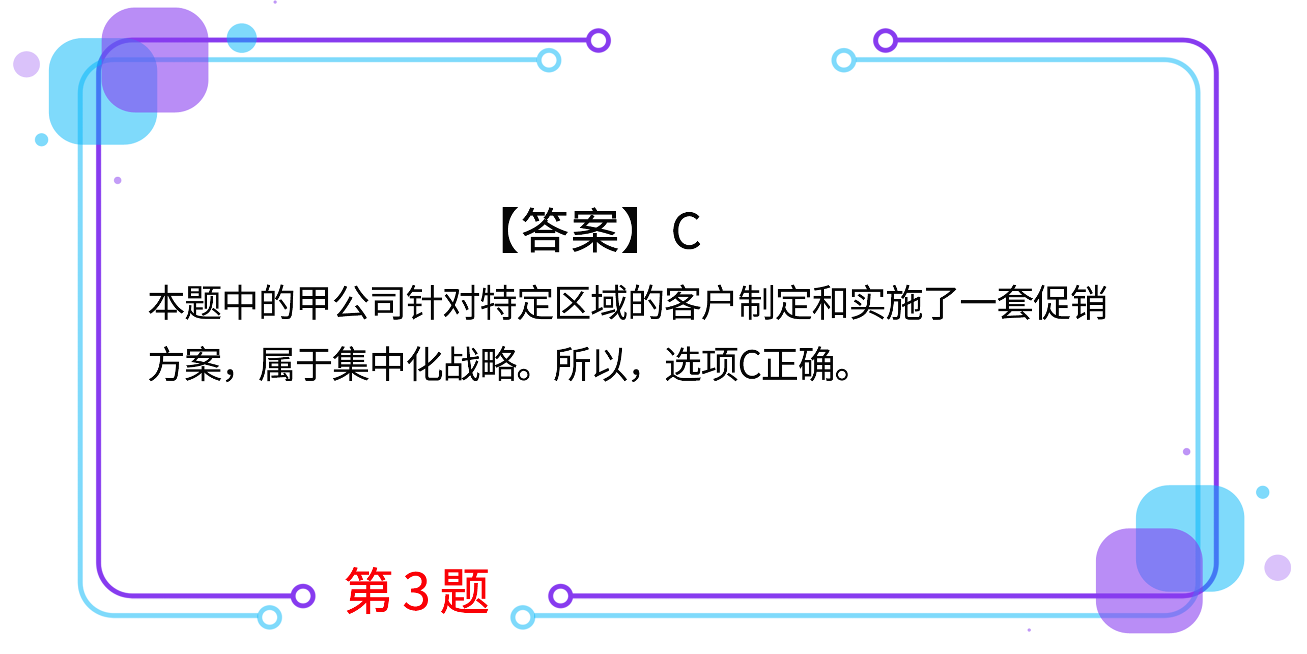 3.甲公司是一家餐飲外賣公司。該公司運(yùn)用大數(shù)據(jù)挖掘技術(shù),對某軟件園區(qū)的客戶訂餐行為進(jìn)行了深入調(diào)查,并根據(jù)調(diào)查結(jié)果,針對該區(qū)域的客戶制定和實(shí)施了一套促銷方案,取得了良好效果。甲公司實(shí)施的競爭戰(zhàn)略屬于( )。(2017年)