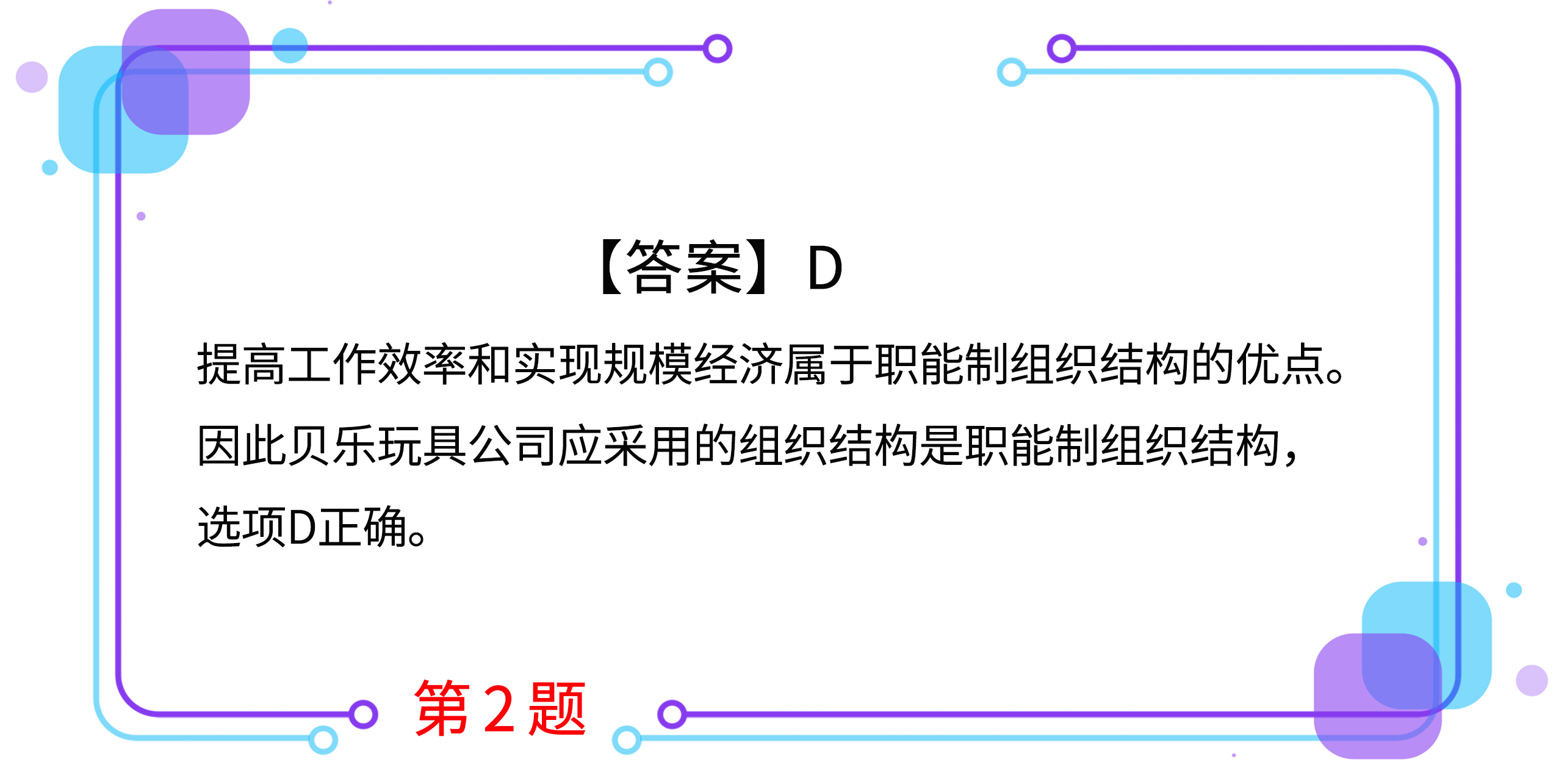 2.貝樂玩具公司成立十年來,生產(chǎn)和經(jīng)營規(guī)模逐步擴(kuò)大,玩具產(chǎn)品的品種不斷增加。為了提高工作效率并實(shí)現(xiàn)規(guī)模經(jīng)濟(jì),該公司應(yīng)采用的組織結(jié)構(gòu)是( )。(2018年)