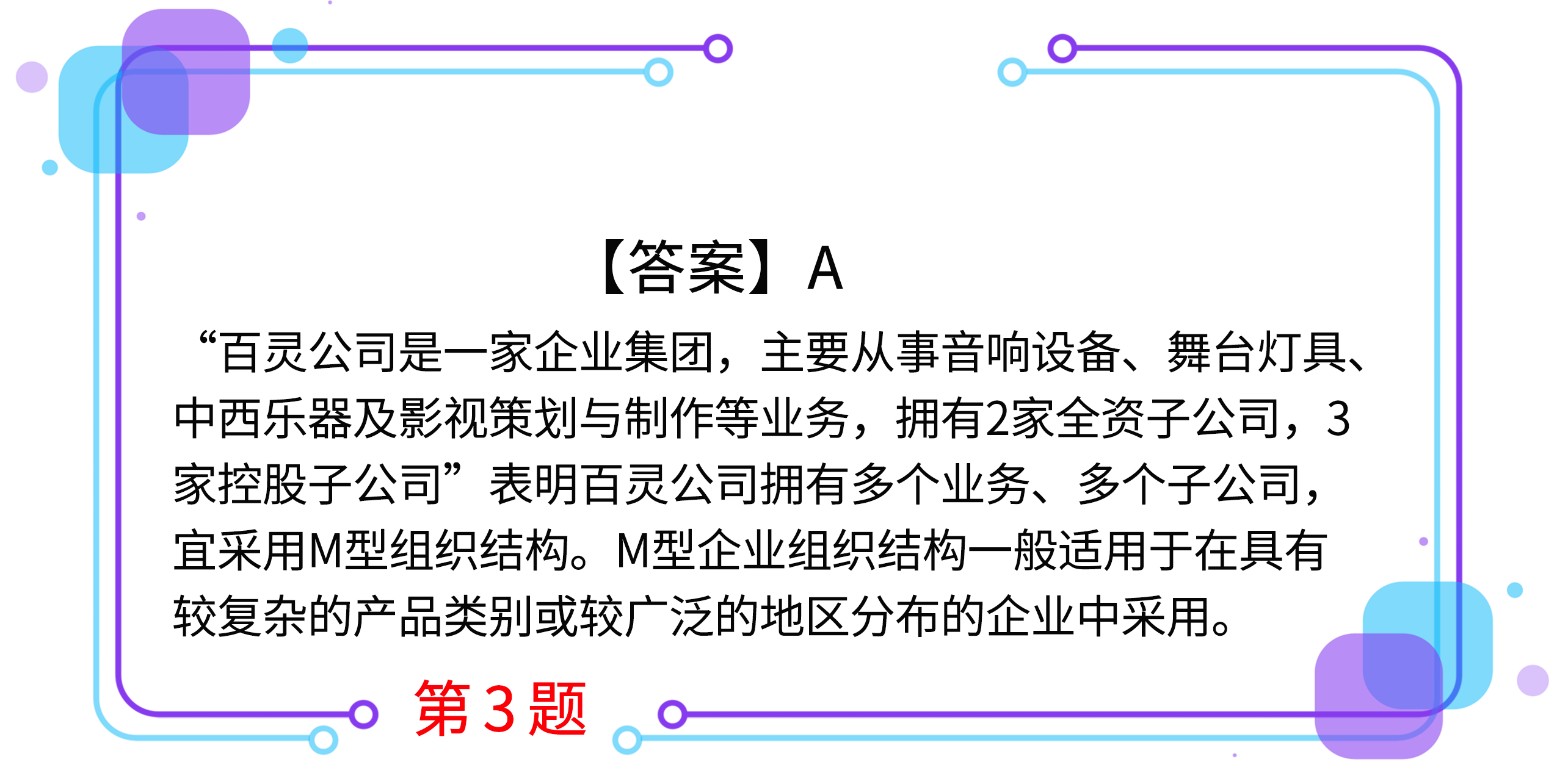 3.百靈公司是一家企業(yè)集團(tuán),主要從事音響設(shè)備、舞臺燈具、中西樂器及影視策劃與制作等業(yè)務(wù),擁有2家全資子公司,3家控股子公司。百靈公司宜采用的組織結(jié)構(gòu)是( )。(2018年)