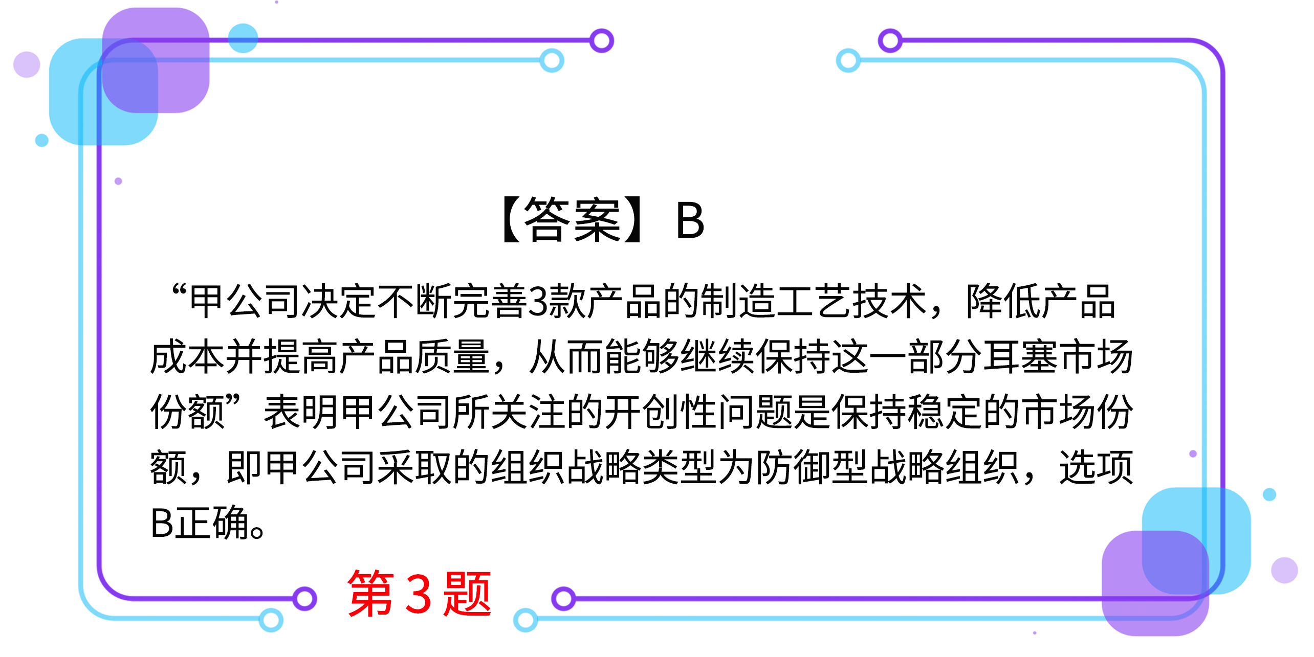 3.甲公司是研發(fā)音樂(lè)耳塞的企業(yè),其近期面向舞臺(tái)表演者和音樂(lè)發(fā)燒友推出的3款“入耳型”音樂(lè)耳塞產(chǎn)品,雖然外形并不時(shí)尚,但憑借著先進(jìn)的音頻技術(shù)和舒適的屏蔽感覺(jué),得到了客戶(hù)的認(rèn)可,甲公司決定不斷完善3款產(chǎn)品的制造工藝技術(shù),降低產(chǎn)品成本并提高產(chǎn)品質(zhì)量,從而能夠繼續(xù)保持這一部分耳塞市場(chǎng)份額。甲公司宜采取的組織戰(zhàn)略類(lèi)型為( )。(2014年)