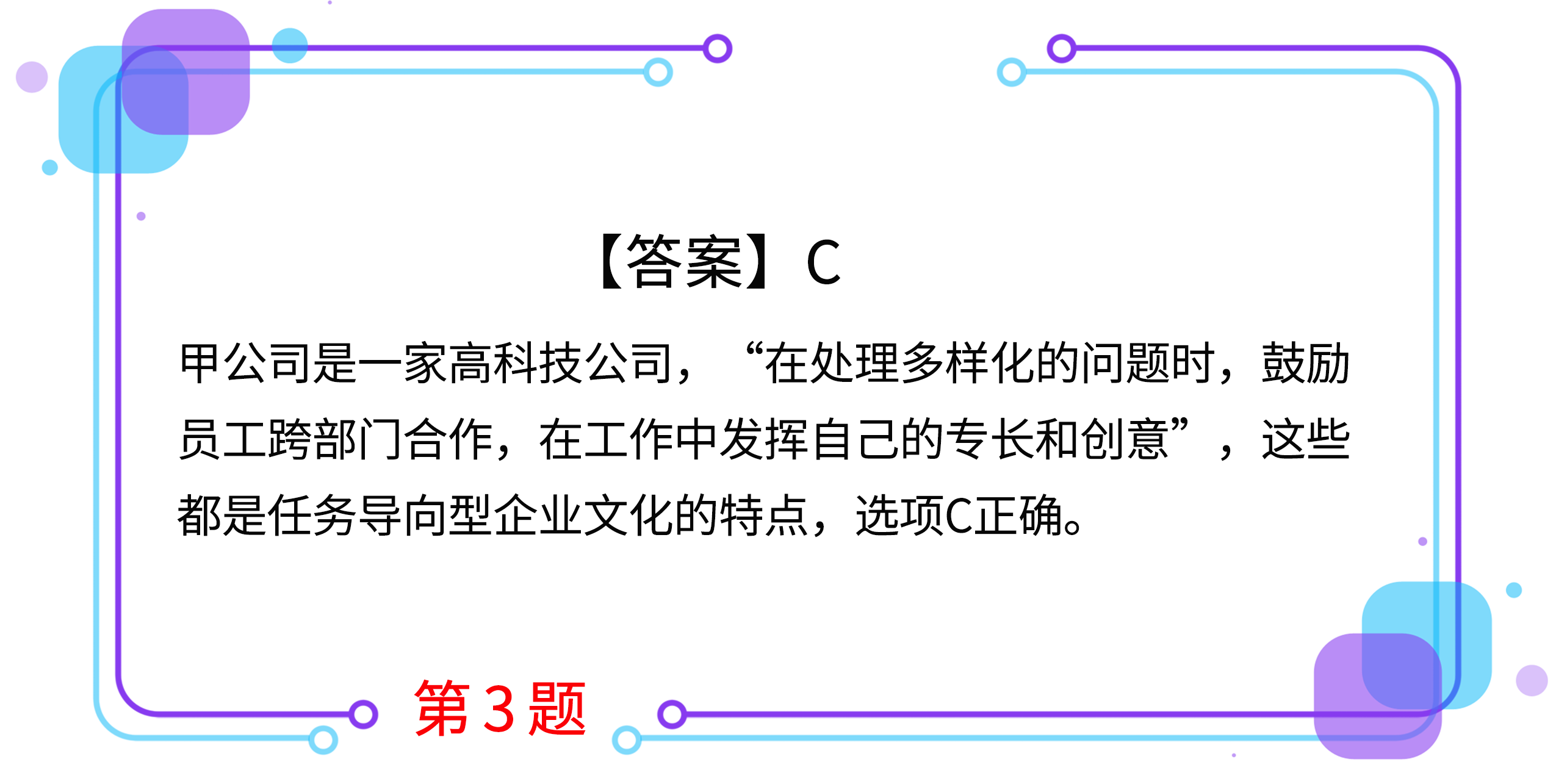 3.甲公司是一家關(guān)注于高科技移動領(lǐng)域的互聯(lián)網(wǎng)公司,公司沒有森嚴的等級制度,強調(diào)員工平等,崇尚創(chuàng)新,在處理多樣化的問題時,鼓勵員工、部門合作,在工作中發(fā)揮自己的專長和創(chuàng)意,努力打造客戶需要的產(chǎn)品,甲公司的企業(yè)文化類型屬于( )。
