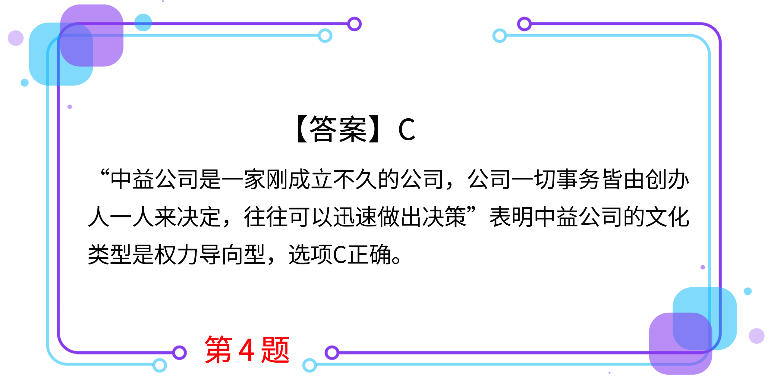 4.中益公司是一家剛成立不久的公司,公司一切事務(wù)皆由創(chuàng)辦人一人來決定,往往可以迅速做出決策。中益公司的文化類型是( )。