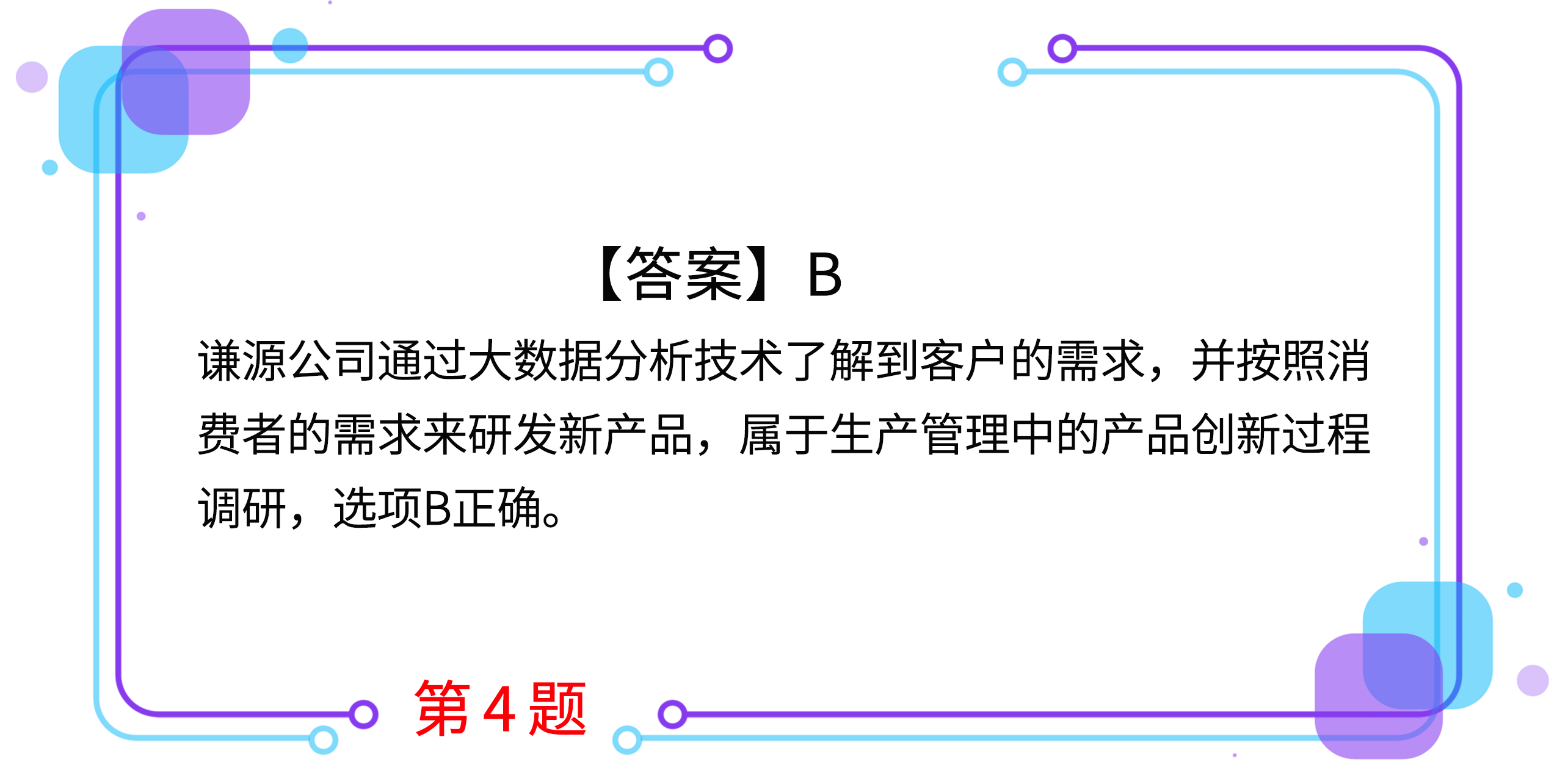 4.謙源公司是一家自行車生產(chǎn)企業(yè)。隨著人們環(huán)保意識(shí)的增強(qiáng),對(duì)于自行車的需求量漸漸增大。謙源公司通過(guò)大數(shù)據(jù)分析技術(shù)對(duì)自行車市場(chǎng)進(jìn)行調(diào)研,發(fā)現(xiàn)消費(fèi)者目前最在意的是自行車的停放問(wèn)題,多數(shù)消費(fèi)者家中沒(méi)有停放位置。謙源公司因此研發(fā)出多款可以折疊的自行車,而且材質(zhì)較輕,安置方便。謙源公司運(yùn)用大數(shù)據(jù)分析影響的企業(yè)戰(zhàn)略轉(zhuǎn)型的主要方面是( )。