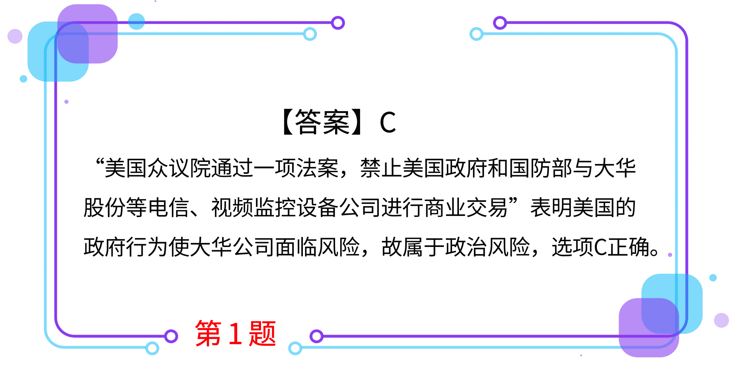 1.2018年5月28日美國(guó)眾議院通過(guò)一項(xiàng)法案,禁止美國(guó)政府和國(guó)防部與大華股份等電信、視頻監(jiān)控設(shè)備公司進(jìn)行商業(yè)交易。在上述案例中,大華公司面臨的風(fēng)險(xiǎn)是( )。