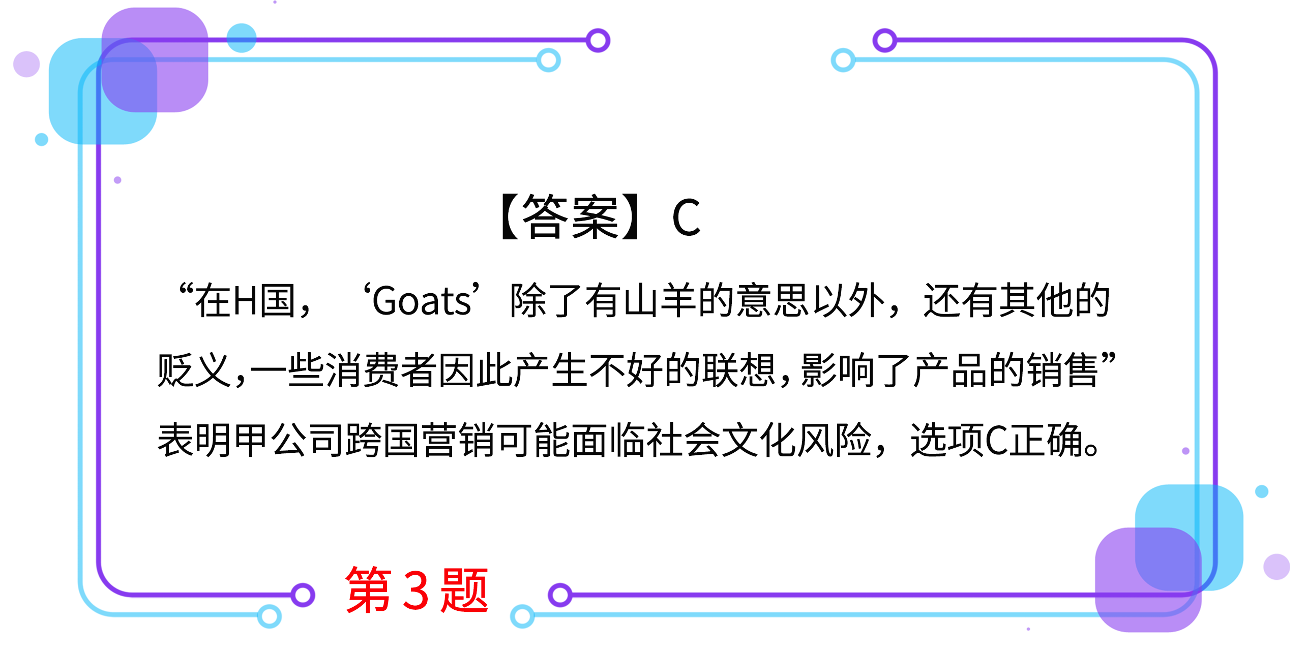 3.我國(guó)某紡織生產(chǎn)企業(yè)甲公司向歐洲H國(guó)出口“雙羊”牌高檔羊絨被,其英文商標(biāo)名為“Goats”。該產(chǎn)品雖然質(zhì)量上乘,但在H國(guó)一直銷路不佳。甲公司進(jìn)行詳細(xì)調(diào)查后發(fā)現(xiàn),在H國(guó),“Goats”除了有山羊的意思以外,還有其他的貶義,一些消費(fèi)者因此產(chǎn)生不好的聯(lián)想,影響了產(chǎn)品的銷售。這個(gè)案例表明,企業(yè)跨國(guó)營(yíng)銷可能面臨( )。(2016年)