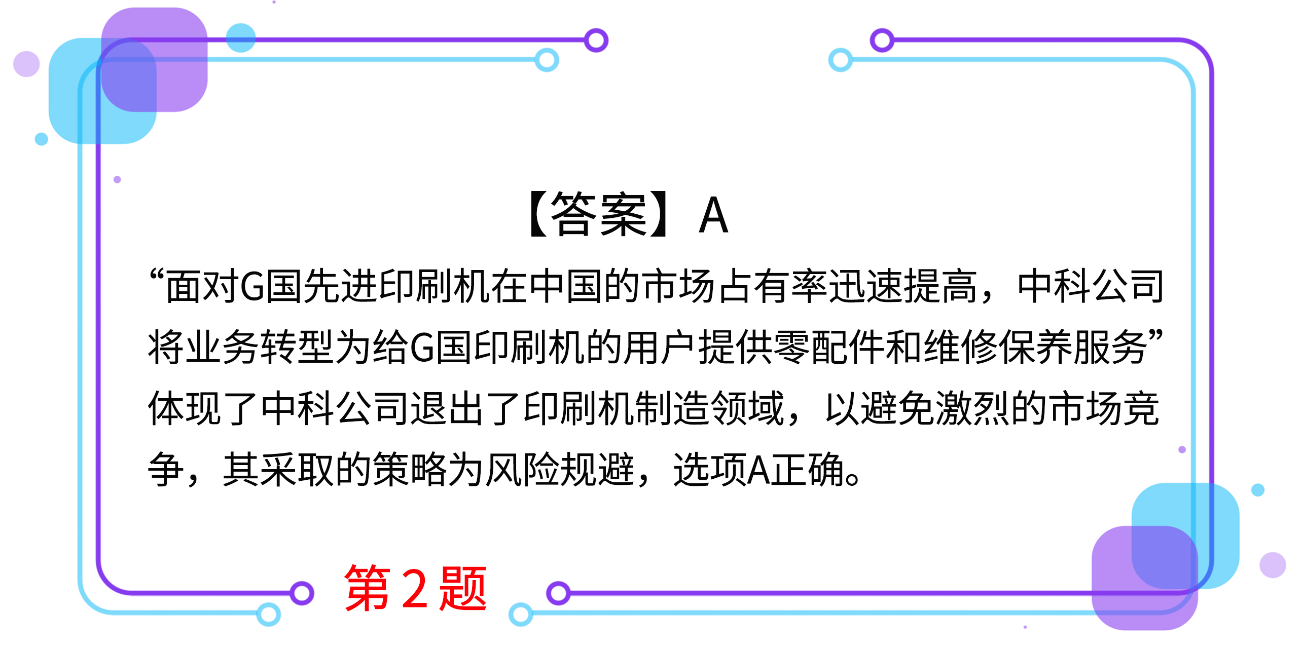 2.中科公司是國內(nèi)一家著名的印刷機(jī)制造商。面對G國先進(jìn)印刷機(jī)在中國的市場占有率迅速提高,中科公司將業(yè)務(wù)轉(zhuǎn)型為給G國印刷機(jī)的用戶提供零配件和維修保養(yǎng)服務(wù),取得比業(yè)務(wù)轉(zhuǎn)型前更高的收益率。從風(fēng)險(xiǎn)管理策略角度看,中科公司采取的策略是( )。(2019年)