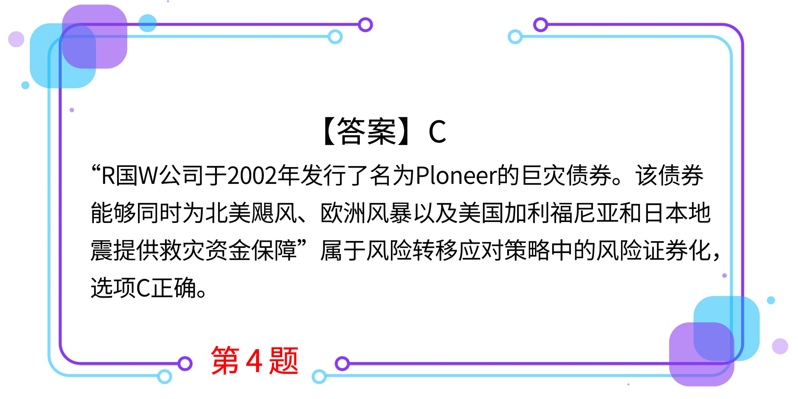 4.R國W公司于2002年發(fā)行了名為Ploneer的巨災(zāi)債券。該債券能夠同時(shí)為北美颶風(fēng)、歐洲風(fēng)暴以及美國加利福尼亞和日本地震提供救災(zāi)資金保障。這種具有金融衍生品特性的債券,屬于風(fēng)險(xiǎn)管理策略工具中的( )。(2016年)