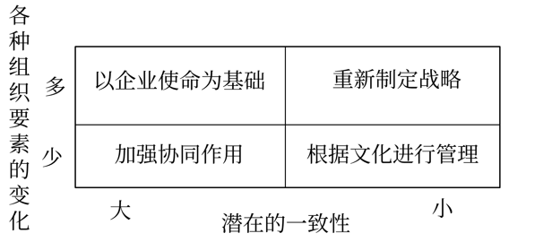 戰(zhàn)略的穩(wěn)定性反映企業(yè)在實(shí)施一個(gè)新的戰(zhàn)略時(shí),企業(yè)的結(jié)構(gòu)、技能、共同價(jià)值、生產(chǎn)作業(yè)程序等各種組織要素所發(fā)生的變化程度;文化的適應(yīng)性反映企業(yè)所發(fā)生的變化與企業(yè)目前的文化相一致的程度。處理二者關(guān)系時(shí)可以用下面的矩陣表示: