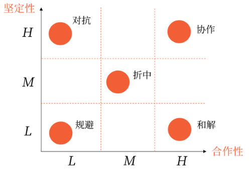 協(xié)作 | ①堅定行為+合作行為的組合 ②考慮雙方利益,尋求相互利益最佳結(jié)合點,并借助合作使雙方利益都滿足。 | 兩合適 |