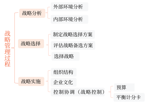 戰(zhàn)略管理過(guò)程包括戰(zhàn)略分析、戰(zhàn)略選擇和戰(zhàn)略實(shí)施三個(gè)環(huán)節(jié),是一個(gè)循環(huán)往復(fù)的過(guò)程。