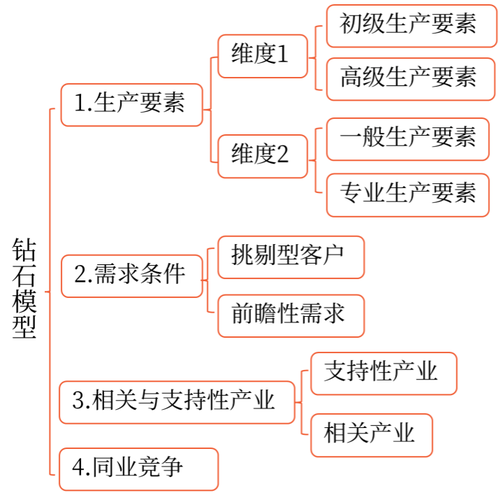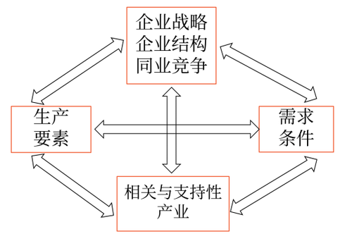 波特識(shí)別出國(guó)家產(chǎn)業(yè)競(jìng)爭(zhēng)優(yōu)勢(shì)的4個(gè)決定因素,并以鉆石圖來顯示: