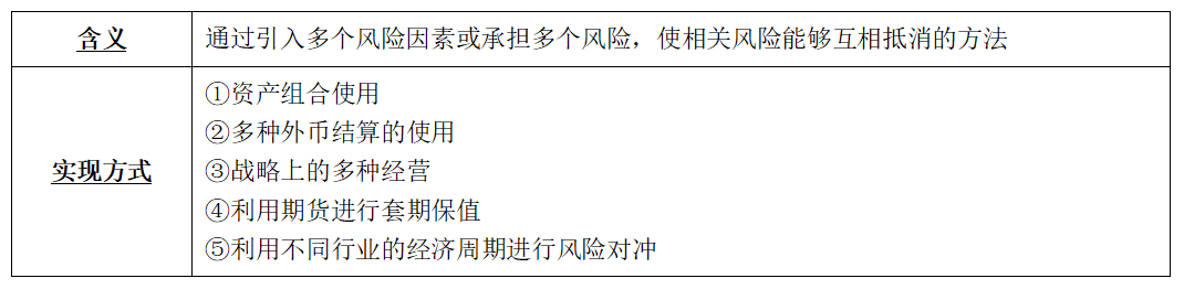 使用風(fēng)險(xiǎn)對(duì)沖,必須是風(fēng)險(xiǎn)組合而不能是單一風(fēng)險(xiǎn),對(duì)單一風(fēng)險(xiǎn)只能進(jìn)行規(guī)避、控制等。
