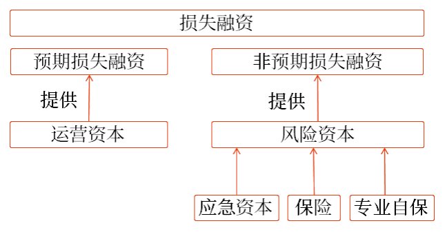 企業(yè)損失分為預(yù)期損失和非預(yù)期損失,因此損失事件融資也相應(yīng)分為預(yù)期損失融資和非預(yù)期損失融資。預(yù)期損失融資一般作為運營資本的一部分,非預(yù)期損失融資則屬于風(fēng)險資本范疇。